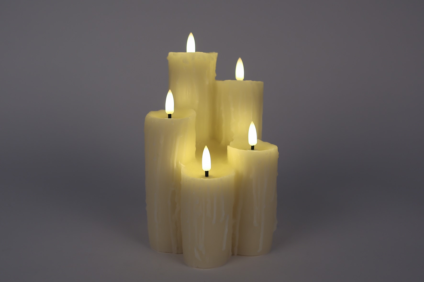 Breng warmte en gezelligheid in huis met deze unieke LED kaarsenset van 5 stuks, ontworpen als een samengesmolten geheel met verschillende hoogtes en decoratief gesmolten kaarsvet-effect. De kaarsen geven een zacht flikkerend licht dat doet denken aan echte vlammen, maar zijn volledig veilig en overal te plaatsen — van de woonkamer tot de slaapkamer, van de eettafel tot bij het haardvuur.