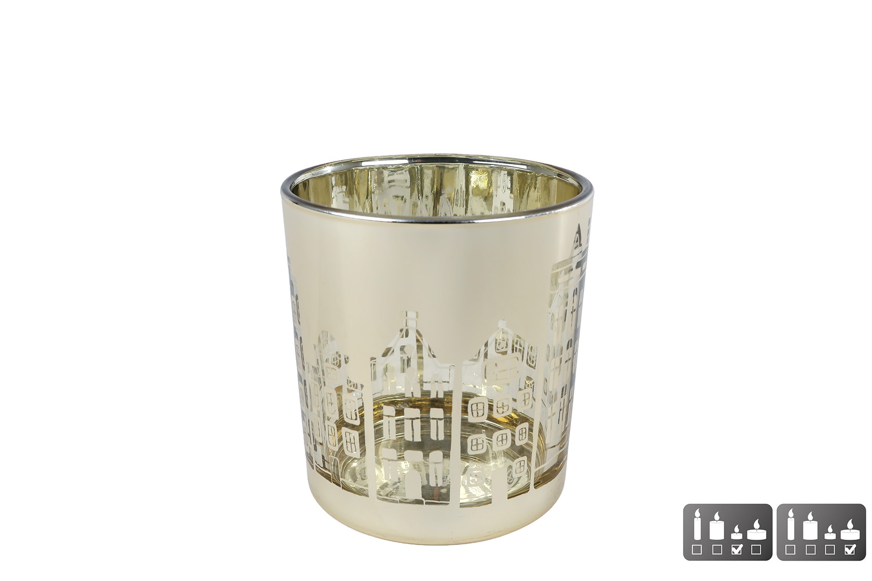 Theelichthouder goudkleurig met huisjes motief